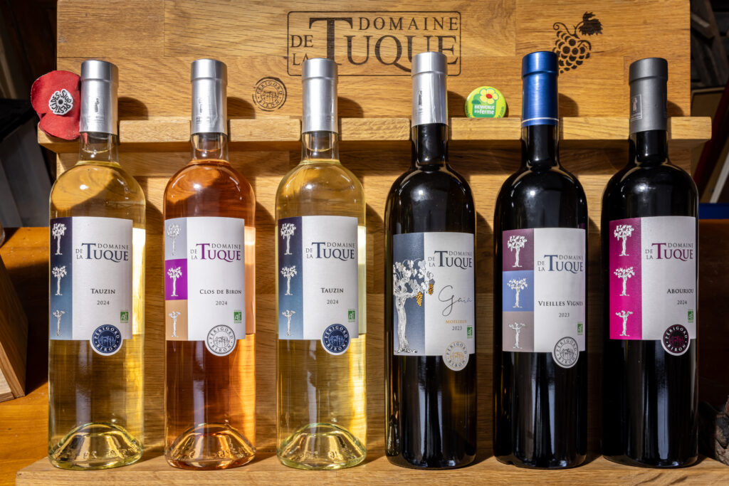 Domaine de la Tuque : L’Éveil d’un terroir historique au Pied de Biron Un Panorama d’Exception au Sud du Périgord Niché sur des coteaux baignés de lumière, le Domaine de la Tuque s’élève sur un promontoire sauvage, offrant un tête-à-tête privilégié avec l’imposante forteresse du Château de Biron. C’est ici, dans ce cadre préservé de la Dordogne, que la nature et l’histoire se rencontrent pour donner naissance à des vins de caractère. La Renaissance d’un Vignoble Le Domaine est avant tout l’histoire d’un défi : celui de Vincent Rivaud et Gilles Detilleux. Ces deux vignerons passionnés ont choisi de redonner vie au vignoble de Biron. Leur démarche ? Une alliance entre tradition et modernité, en replantant les cépages anciens de ce terroir unique. L’Engagement Bio : Le Respect de la Terre Au Domaine de la Tuque, la qualité du vin commence par la santé de la terre. Depuis la création de l’exploitation, nous cultivons nos vignes selon les principes de l’Agriculture Biologique (Label AB) : Zéro produit chimique : Ni pesticides, ni fertilisants de synthèse. Fertilité naturelle : Nous produisons nos propres engrais verts pour nourrir la terre. Biodiversité préservée : Un travail quotidien pour maintenir l’équilibre de la faune et de la flore sur nos coteaux. Des Vins Biologiques IGP Périgord Nous élaborons avec soin une gamme complète de vins biologiques sains sans collages sans produits animales Notamment des cuvées emblématiques Le Tauzin, Les Terres Rouges et le fameux et unique Abouriou. Vivez l’Expérience à la Propriété Le Domaine de la Tuque est un lieu de vie et de partage ouvert à tous, tout au long de l’année. Visites & Dégustations : Plongez dans les coulisses de la production bio et apprenez-en plus sur nos savoir-faire lors d’une balade pédagogique. Séjour en Gîte : Prolongez l’expérience en séjournant dans notre gîte situé au cœur des vignes. Une immersion totale pour un réveil face au Château de Biron.