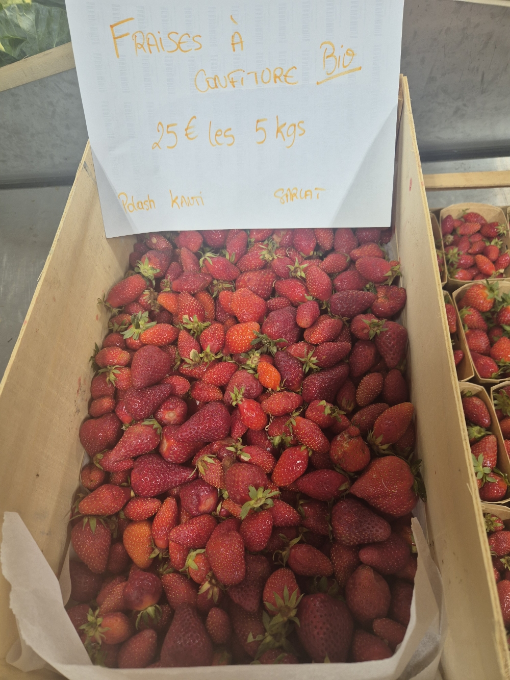 🍓 Vous aurez la possibilité de commander des fraises bio de chez Polash, ainsi que des fraises conventionnelles de chez Mazet à Nabirat. Attention, les tarifs diffèrent selon le producteur.