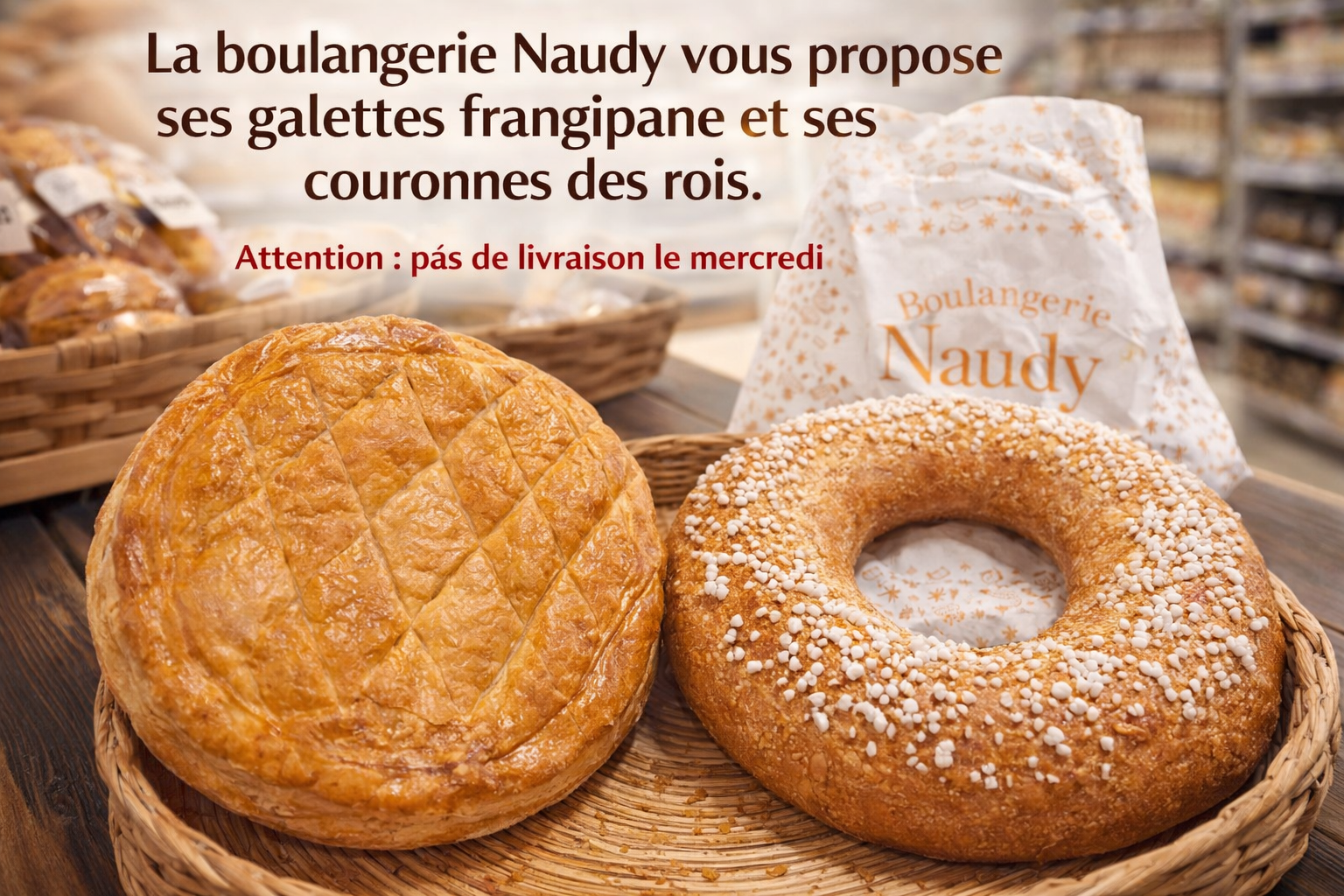 La boulangerie Naudy vous propose ses délicieuses galettes frangipane et ses savoureuses couronnes des rois. ![]()